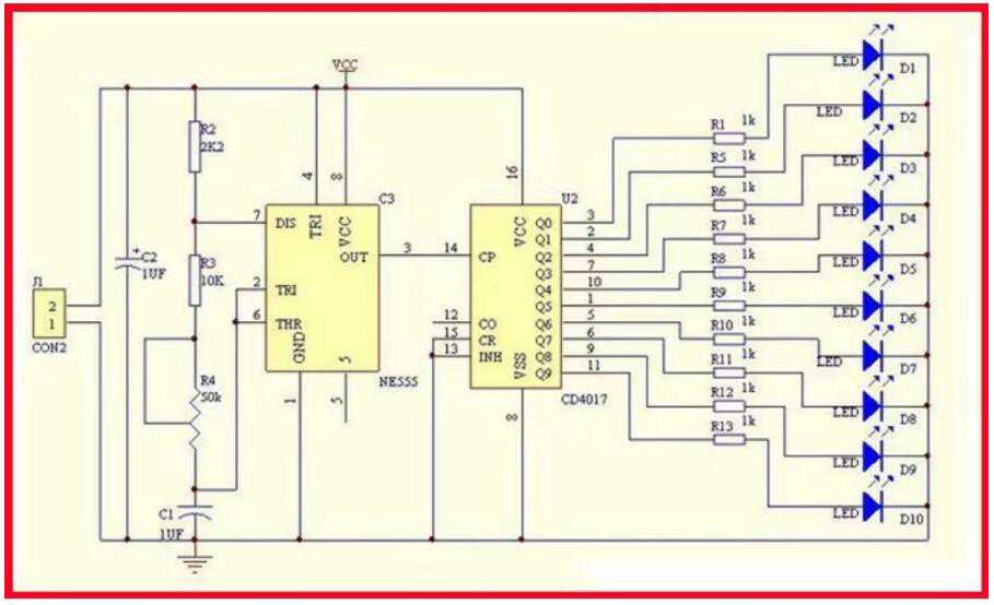 当NE555的时钟振荡信号不断的加在CD4017的14脚,在CD4017的10个输出端上接有10只LED,当CD4017的10个输出端在时钟信号作用下轮流产生高电平,则D1--D10依次被点亮,从而形成流水灯效果。调节电位器的大小,可以改变频率从而改变流水灯的速度。