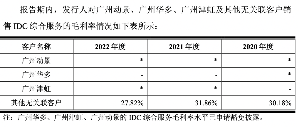 但值得注意的是,一轮问询回复提到,报告期内尚航科技销售给广州动景、广州华多、广州津虹的IDC综合服务毛利率低于其他无关联客户。