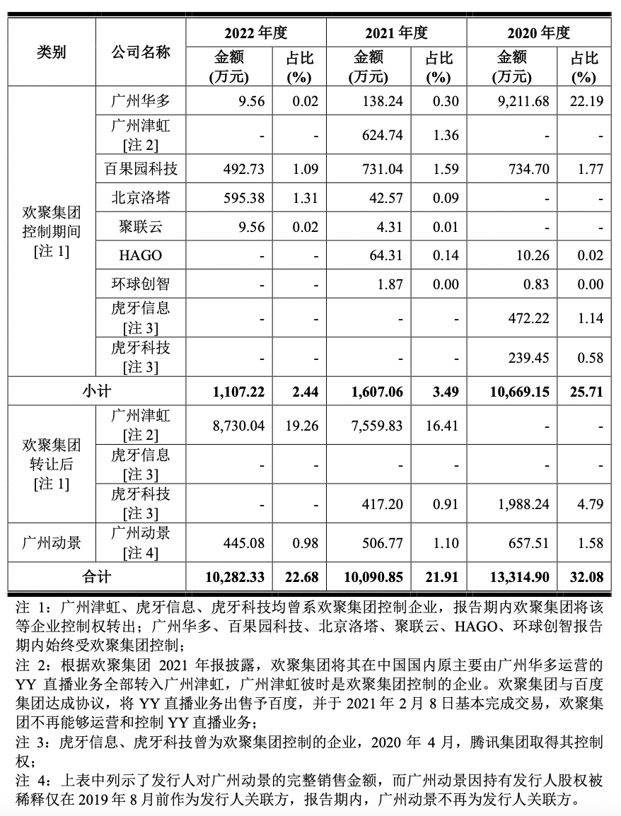 根据问询回复,2021年前,欢聚集团以广州华多运营其在国内的YY直播业务,2021年2月,欢聚集团将广州华多的YY直播业务全部转入广州津虹并将广州津虹出售给与公司无关联关系的百度,因此,公司与广州华多的原有业务也一并转移至广州津虹。2022年2月开始,广州津虹不再被视同为公司关联方,公司与其交易不再作为关联交易披露。