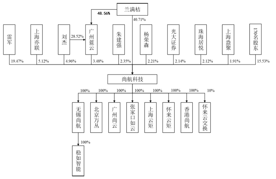 IPO前,兰满桔为公司控股股东、实控人,雷军为尚航科技第二大股东,持有公司19.47%的股份。