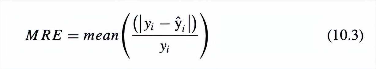 均相对误差(MRE)是预测值与实际值的绝对偏差的平均值除以实际值。该度量用于评估质量,MRE的计算方式如下(参见公式10.3):