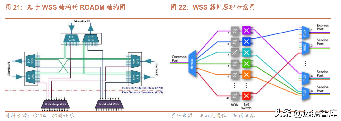 波长选择开关(WSS,WavelengthSelectiveSwitch),是可重构的光波分复用器(ROADM,ReconfigurableOpticalAdd/DropMultiplexing)的核心关键模组,其对ROADM设备的重要性相当于PC的CPU,ROADM根据使用场景和规格不同,需要多个WSS器件。