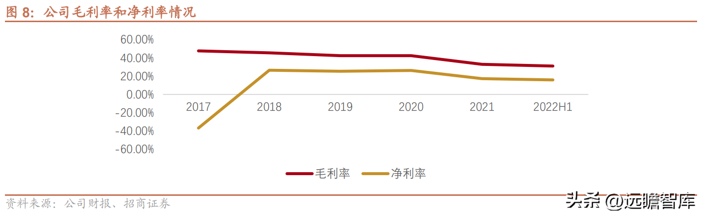 其中,2017年的净利率较为异常,主要原因是股权支付带来的管理费用较高。2022H1,公司净利率为15.98%,同比下降0.87个百分点。