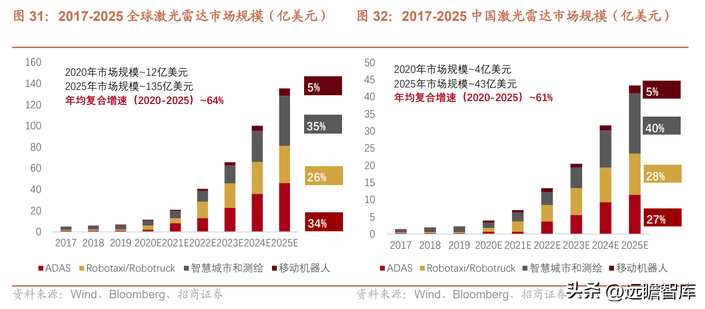 车载激光雷达市场占比超过50%,预计2025年全球车载激光雷达(无人驾驶+ADAS)市场规模将超过80亿美元(约合人民币518亿元)。(注:据Velodyne预测,2026年汽车领域激光雷达市场规模将达到168亿美元,若激光雷达成本快速下降,并向L3以下级别自动驾驶渗透,带动渗透率迅速提升,上述预测具有合理性)。