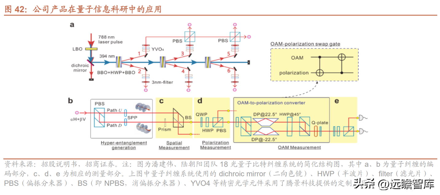 下图光量子比特纠缠系统及测量部分中,使用的半波片、滤光片、偏振分束器、非偏振分束器等光学元件及YVO4等晶体材料采用了腾景科技的产品,公司提供的精密光学元件是上述光量子比特纠缠系统的关键组成部件。公司主要为中科大提供科研项目的产品支持,多为定制化产品,每年的采购量在百万元水平。