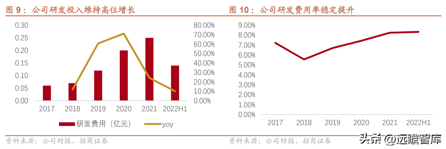 2022H1,公司综合毛利率为31.12%,同比下降1.17个百分点。净利率方面,公司2021年净利率为17.27%,同比下降9.06个百分点,主要是由于公司费用率提升较明显,尤其是研发费用占比增长较快。
