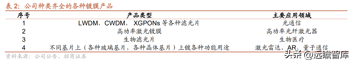 2015年公司通过自研突破高功率光学元件和光纤器件技术,实现高功率镀膜光纤线量产,进入锐科激光等知名光纤激光器厂商的供应链体系,产品得到了国内主流激光器制造厂商认可;2016年公司实现球面光学元件、高功率偏振分束器(PBS)的量产,将下游市场拓展到光通信领域,开始与Lumentum、Finisar以及光迅科技等光模块厂商建立合作关系;2017年公司突破了光学薄膜窄带滤光片制备技术,实现了粗波分复用器(CWDM)滤光片规模化、低成本量产,进入了苏州旭创的供应链体系。