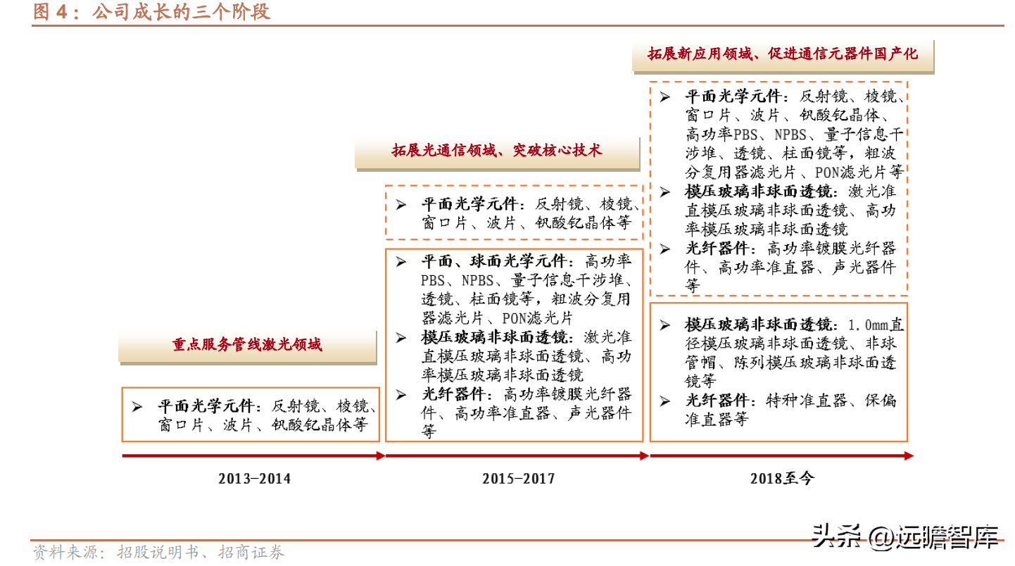 第一阶段为公司的筹备发展阶段,公司2013年成立即引入光学冷加工生产线,产品主要是平面光学元件,包括反射镜、棱镜、窗口片等,主要面向光纤激光市场。