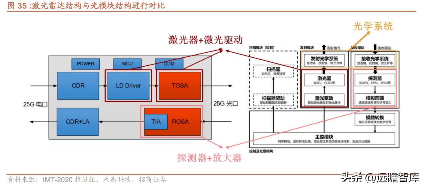 激光雷达主要由发射模块、接收模块、扫描模块和主控模块四部分组成。在光器件元件中,光发射模块和光接收模块成本占比较高。