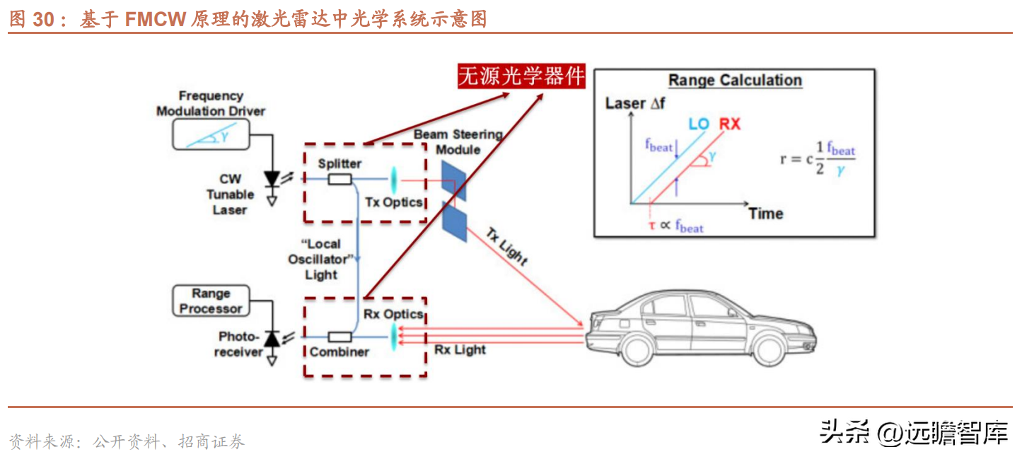 根据产业调研,激光雷达光路部分元件的单台价值量约为500~1000元;一般激光雷达中,光芯片(激光器+探测器)成本占比大于30%,与光模块的BOM成本结构相似。同时光无源器件的作用也非常重要,可以提高出射激光的质量和接收端的耦合效率,进而降低激光雷达的成本和提高工作性能。