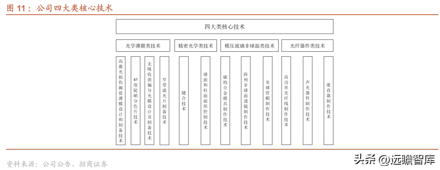 公司经过多年的研发经验积累,在光学薄膜、精密光学、模压玻璃非球面、光纤器件等技术上均实现突破,掌握的核心技术覆盖光电器件制造的主要环节,能够生产客户定制的产品。