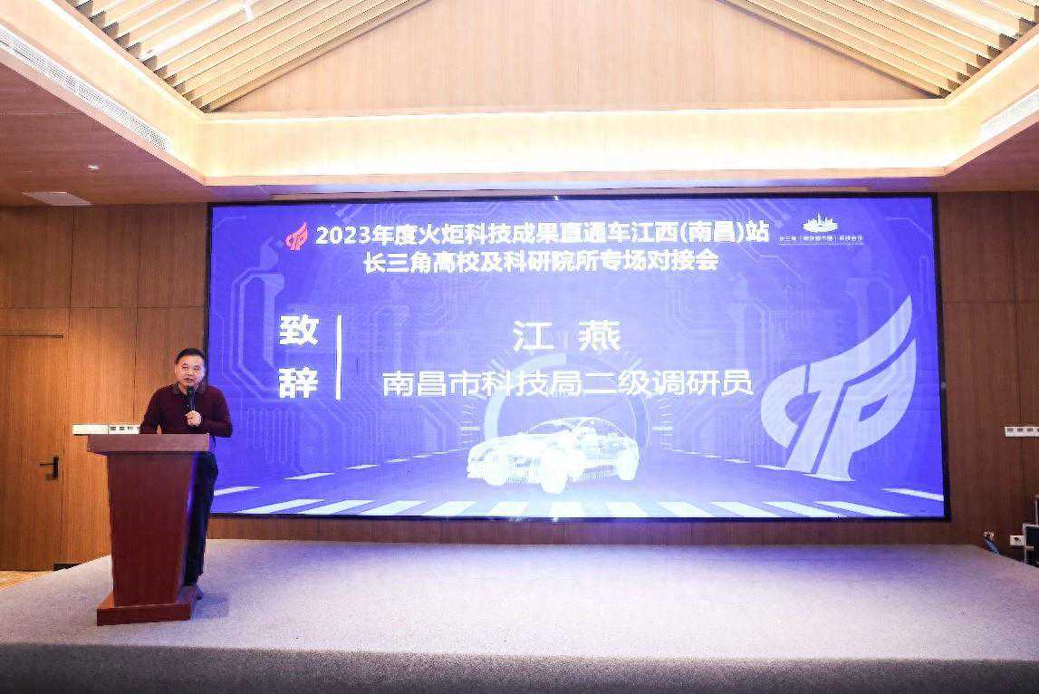 南昌市科技局二级调研员江燕为本次对接会致辞。江燕表示,南京科教资源丰富,高新技术产业和战略性新兴产业连接成链、集聚成群,是全国科创高地和创新策源地。2023年度火炬科技成果直通车江西(南昌)站来到六朝古都南京,希望进一步推进与南京市高校及科研院所科技、人才的有机结合,深度学习南京市在推动在产学研合作与科技成果转化方面的先进经验做法,搭建高层次的成果交流对接平台,开辟一条优质科技成果与南昌重点企业精准匹配的新途径,助力南昌产业转型升级。