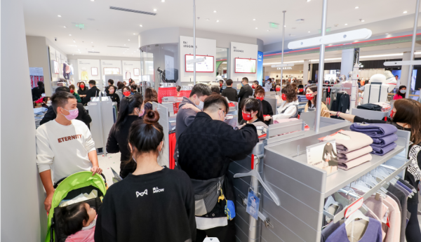 外场太空人巡演,吸引人群驻足合影,走进门店,银色的主色调扑面而来,科技感满满。据悉,该店占地面积超200平方米,是猫人目前最大的线下门店,是其在汉打造科技内衣的标杆店。