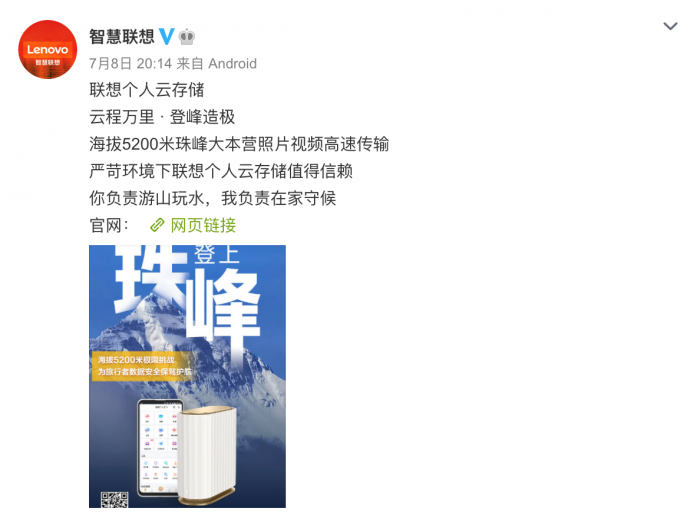 昨日,@智慧联想官方发布微博,官宣联想个人云存储在珠峰完成了远程数据传输任务,此次在覆盖珠峰地区的5G网络的加持下,联想个人云存储顶住了珠峰大本营严苛的网络环境考验,顺利完成了远程数据传输任务并且全程保持高速稳定,可以看出产品实力值得肯定。