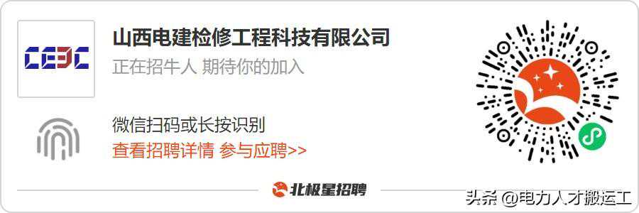 hi,各位老铁,电力人才搬运工前来报到,今天要给老特们分享的是山西电建检修工程科技有限公司。山西电建检修工程科技有限公司(以下简称检修公司)成立于2015年5月,是中国能源建设集团山西电力建设有限公司下属的一家具有独立法人资格的全资子公司,检修项目众多,运维经验丰富。公司于山西多个地区都有招聘需求哦,热招汽机专业、锅炉专业、灰硫专业主责工、电仪专责工等多个岗位,更有岗位经验不限、学历不限~话不多说,直接上干货: