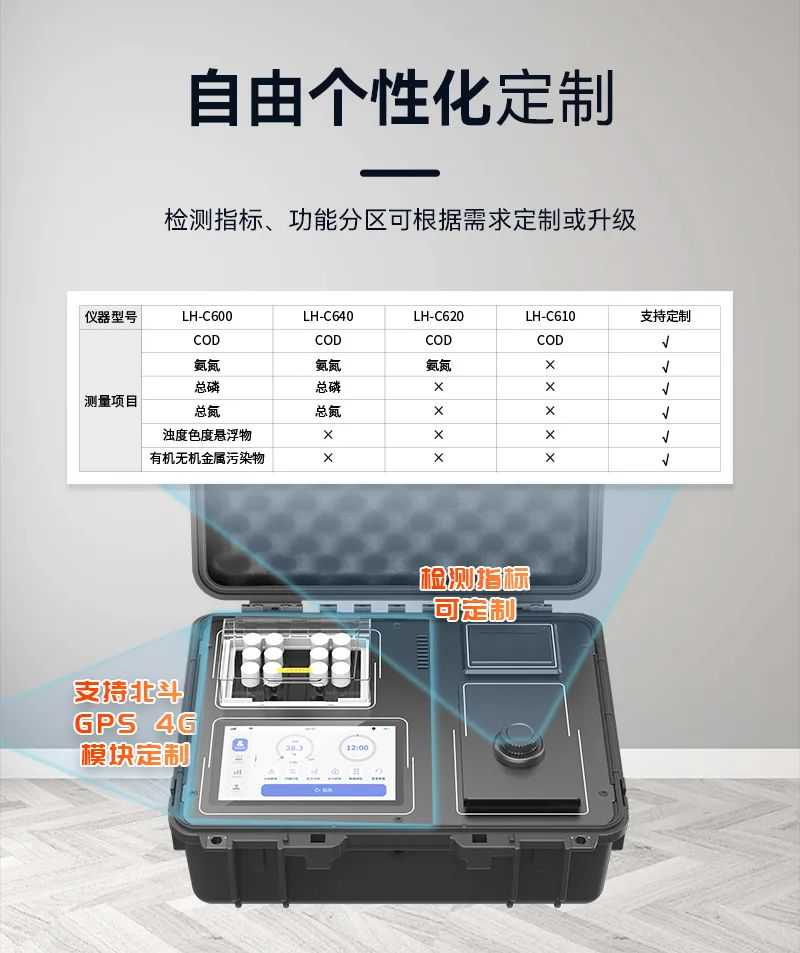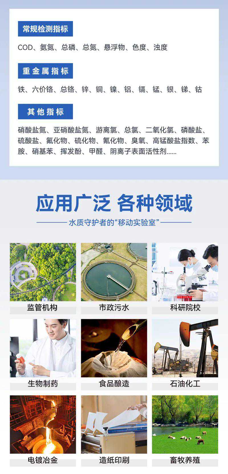 1、六十余项指标:直接测定化学需氧量(COD)、氨氮、总磷、总氮、悬浮物、色度、浊度、重金属、有机污染物和无机污染物等多项指标,浓度直读;