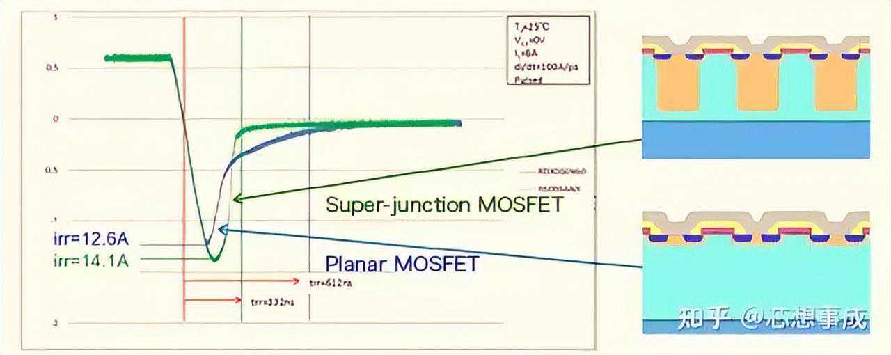 超级结中,trr比平面MOSFET快,irr电流更大