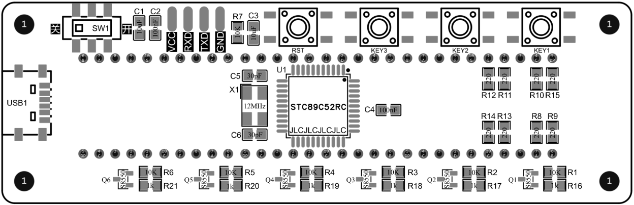 ②焊接STC89C52RC芯片时要注意方向,圆点标识的为1脚,如果芯片上有多个圆点,通常为最小的圆点;