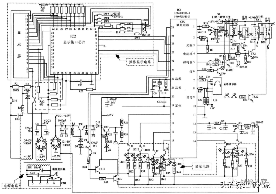 美的MD-KD23C-AK微波炉是电脑式微波炉,当电脑式微波炉不能工作时,应检测CPU工作条件(供电、复位、晶振)是否异常,各直流供电是否异常。下图所示为该微波炉电路图。