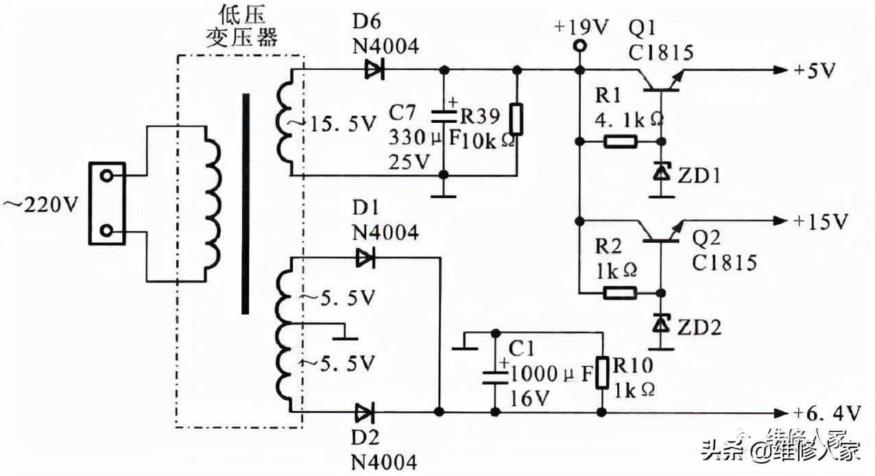 微波炉电脑控制装置能够正常工作所需的电源都是经由电源电路中的变压器进行转换而来的。其中为显示屏供电电压,经桥式整流堆整流成-25V作为显示集成电路IC2的供电电压,经桥式整流堆整流后,则成为+15V直流电压,作为控制电路供电电压。