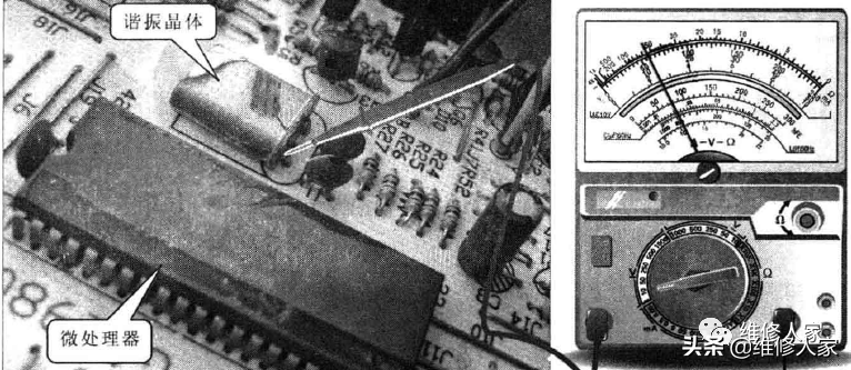 此时,即有可能是谐振晶体损坏,也有可能是微处理器内部的谐振电路损坏。区分方法是可以使用万用表检测谐振晶体引脚的电压,正常时应分别为2.4V和0.6V左右,如下图所示。