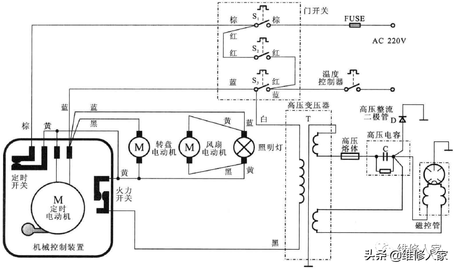 由于能够听到“吱吱"的打火声,说明电源220V已经输入到微波炉内部,此时,怀疑是微波炉的门开关或控制装置有故障。下图所示为该微波炉电路图。