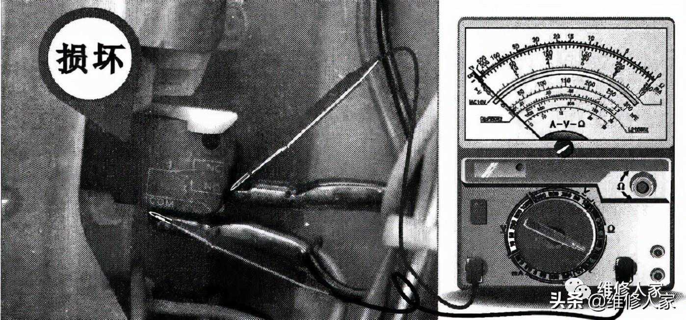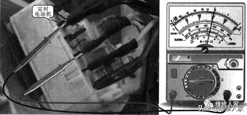 检测机械控制装置各引脚之间的阻值,结果发现定时开关的两个引脚间的阻值较大(应接近0),如下图所示,由此可以判断定时开关损坏。