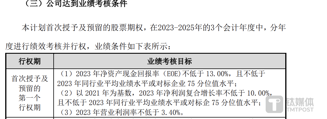 钛媒体APP注意到,公司此前曾推出2022年股票期权激励计划,考核期限为2023年至2025年,公司以净资产现金回报率、净利润复合增长率、营业利润率为考核指标。不过,单以净利润指标来看,在连续两年业绩下滑的背景下,公司未能完成2023年的目标。
