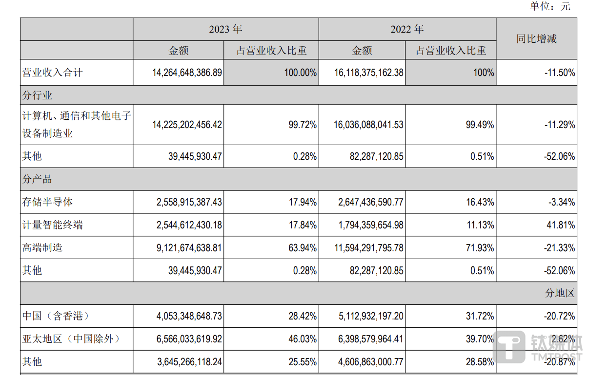 具体来看,报告期内,计量智能终端实现收入25.45亿元,同比增长41.81%。储半导体业务和高端制造业务则分别实现营收25.59亿元、91.22亿元,分别同比下滑3.34%、21.33%。其中,高端制造业务作为公司的营收主力军,下滑幅度较大。