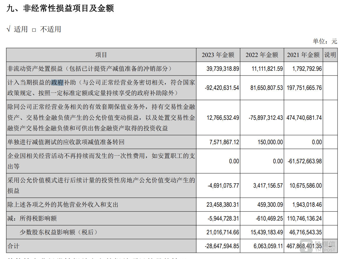 2023年,公司收到的政府补贴金额为8000多万元,但在该年度按比例退回2018年收到的产业发展扶持基金1.75亿元,导致政府补贴金额为负,对净利润造成影响。