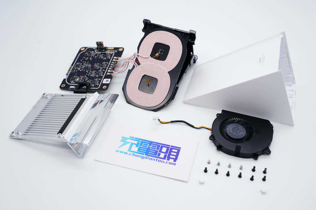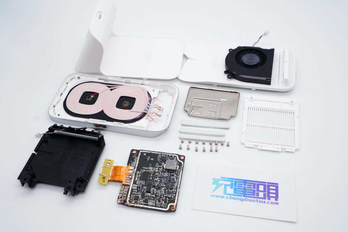 充电头网通过拆解发现,虽然造型ID没有大的改动,但内部布局相较上一代却有着不小的变化。支撑板内置双线圈,无线充电体验得到进一步提升;同时散热风扇移到了底座里,通过特殊设计的塑料壳进行导风,实现电路板和支撑板双散热效果。