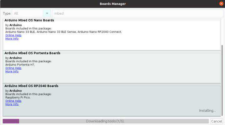 然后,去BoardsManager中,查找mbed,然后安装“ArduinombedOSRP2040Boards”