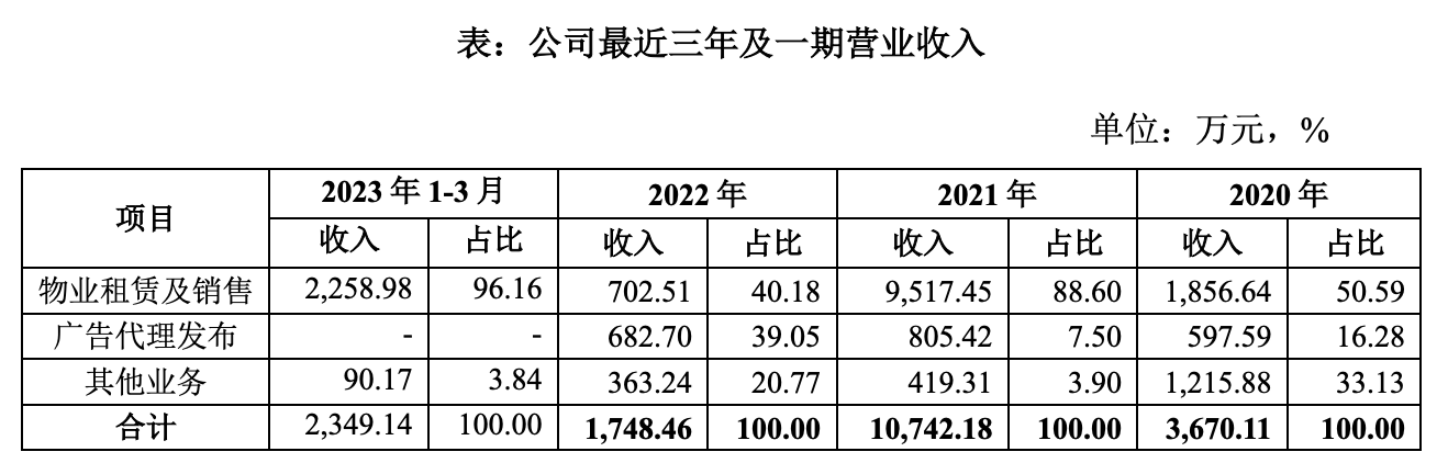 公司目前主要业务类别分为股权直投业务、基金投资管理、物业管理和广告。股权直投业务和基金投资管理业务收入在财务报表中体现为投资收益。营业收入主要体现的是物业租赁及销售、广告代理发布及其他业务。