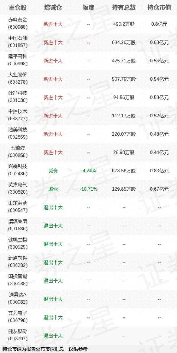 证券之星消息,4月22日光大保德信基金旗下黄波管理的光大保德信信用添益债券型基金公布一季报,近1年净值增长率-16.82%。与上一季度相比,该基金前十大重仓股新增赤峰黄金,中国石油,隆平高科,大业股份,仕净科技,中控技术,洁美科技,五粮液;其中兴森科技持仓占比1.32%,为该基金第一大重仓股;山东黄金,旗滨集团,健帆生物,新点软件,国投智能,深桑达A,艾为电子,健友股份等退出前十大重仓股;详细数据如下: