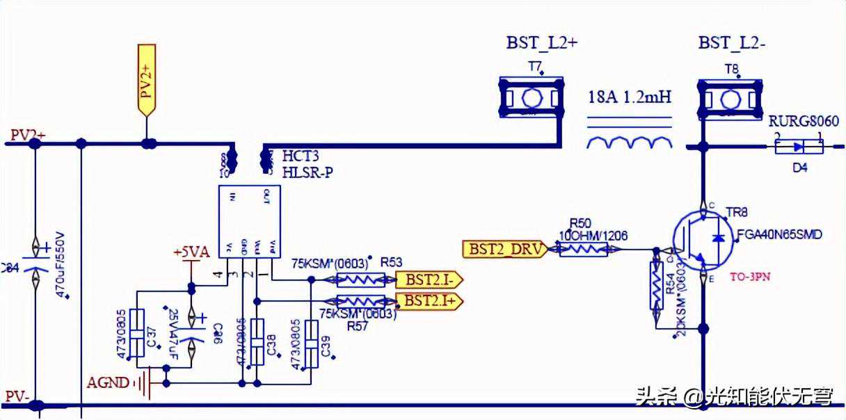 2路PV输入经EMC滤波后负极短在一起,正极独立,霍尔放在正极采电感电流.输出汇入Bus.