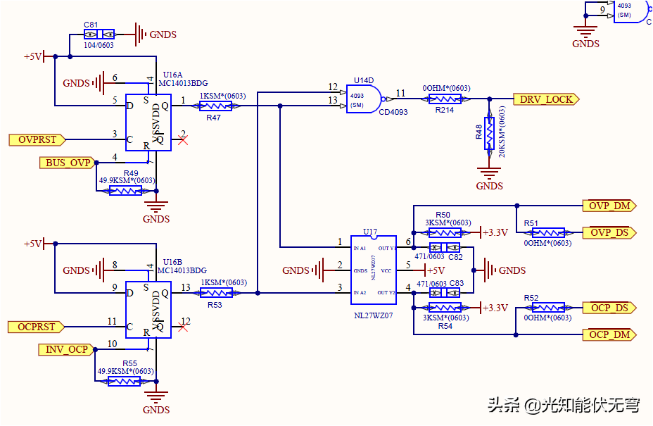 硬件采用差分采样电路,经运放TL074衰减后送入DSP.采样信号中,Bus电压和逆变电流信号会通过比较器LM339与基准电压比较,若超过设定的基准电压,过压和过流保护信号BUS_OVP和INV_OCP由低变高,DQ触发器MC14013输出变低电平并锁定,差分驱动芯片AM26C31输出被锁定为高阻,故障信号同时会送入DSP处理.若DSP判断故障恢复,则通过RST信号使DQ触发器复位,解除对差分驱动芯片的锁定.