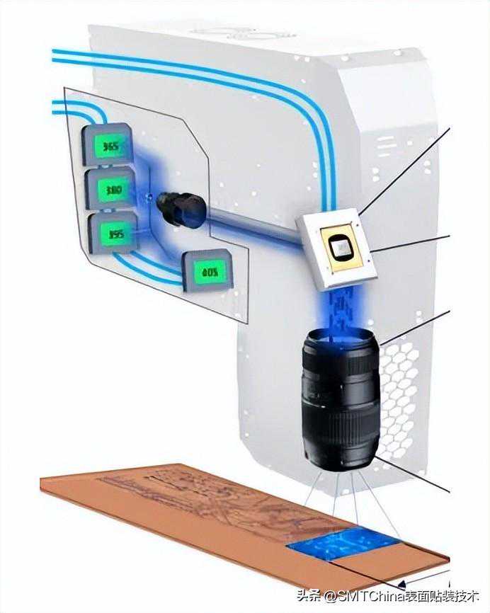 DI曝光机具有较高的加工精细度,一开始主要用于HDI板内层或外层光致抗蚀剂的曝光,近年来因DMD技术的发展,逐步应用于外层阻焊的曝光,曝光时不需要菲林底片,节省了底片的制作成本,缩短了制程时间。使用的紫外光发射光源也是紫外发光二极管,紫外光谱集中在365~405nm一个窄带。