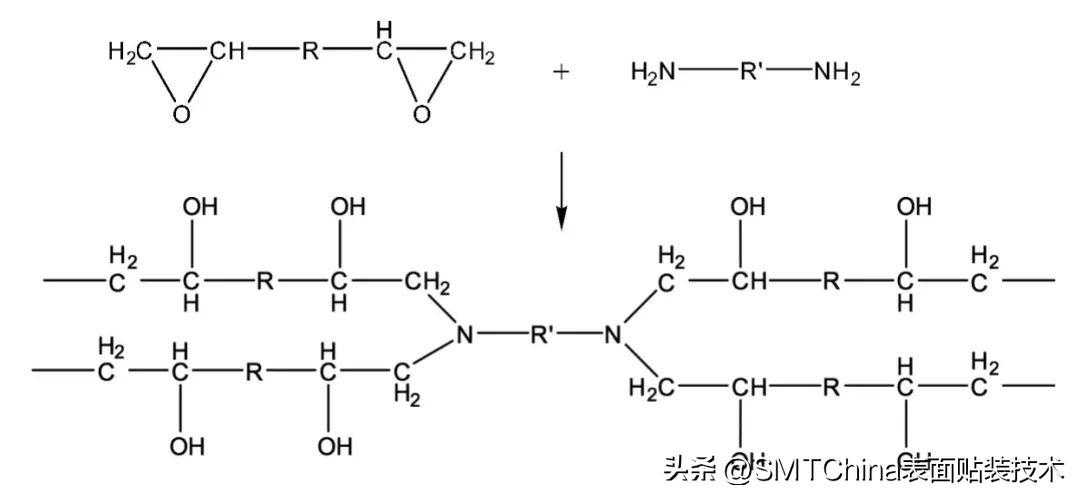 油墨的热反应包括两部分的反应,一是主剂中的感光树脂与硬化剂中的环氧树脂之间的热反应,二是油墨中的热固化促进剂(主要是胺类树脂)与环氧树脂之间的热反应。化学反应式如下: