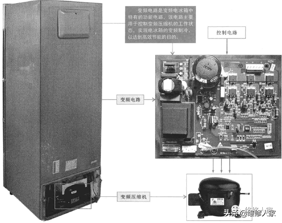 在变频电冰箱中压缩机由变频电路控制启动和停止。