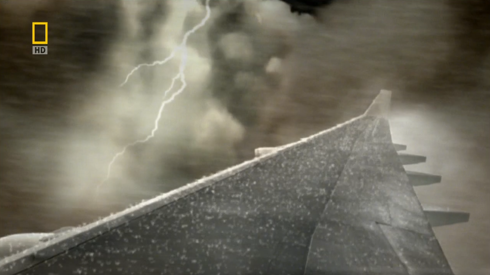 空中浩劫画面:AF358穿越暴雨云团的时候舷窗外电闪雷鸣的震撼场面
