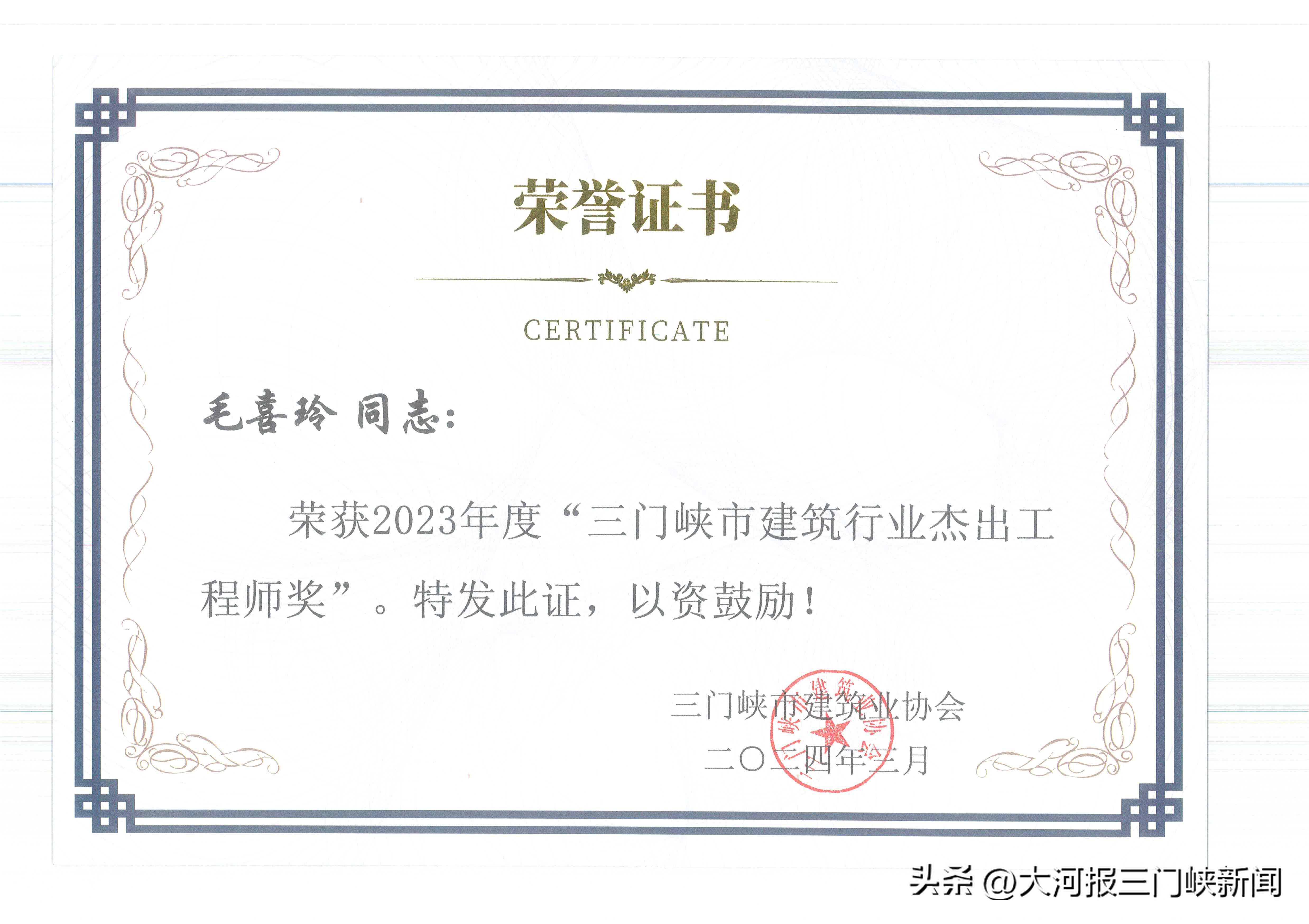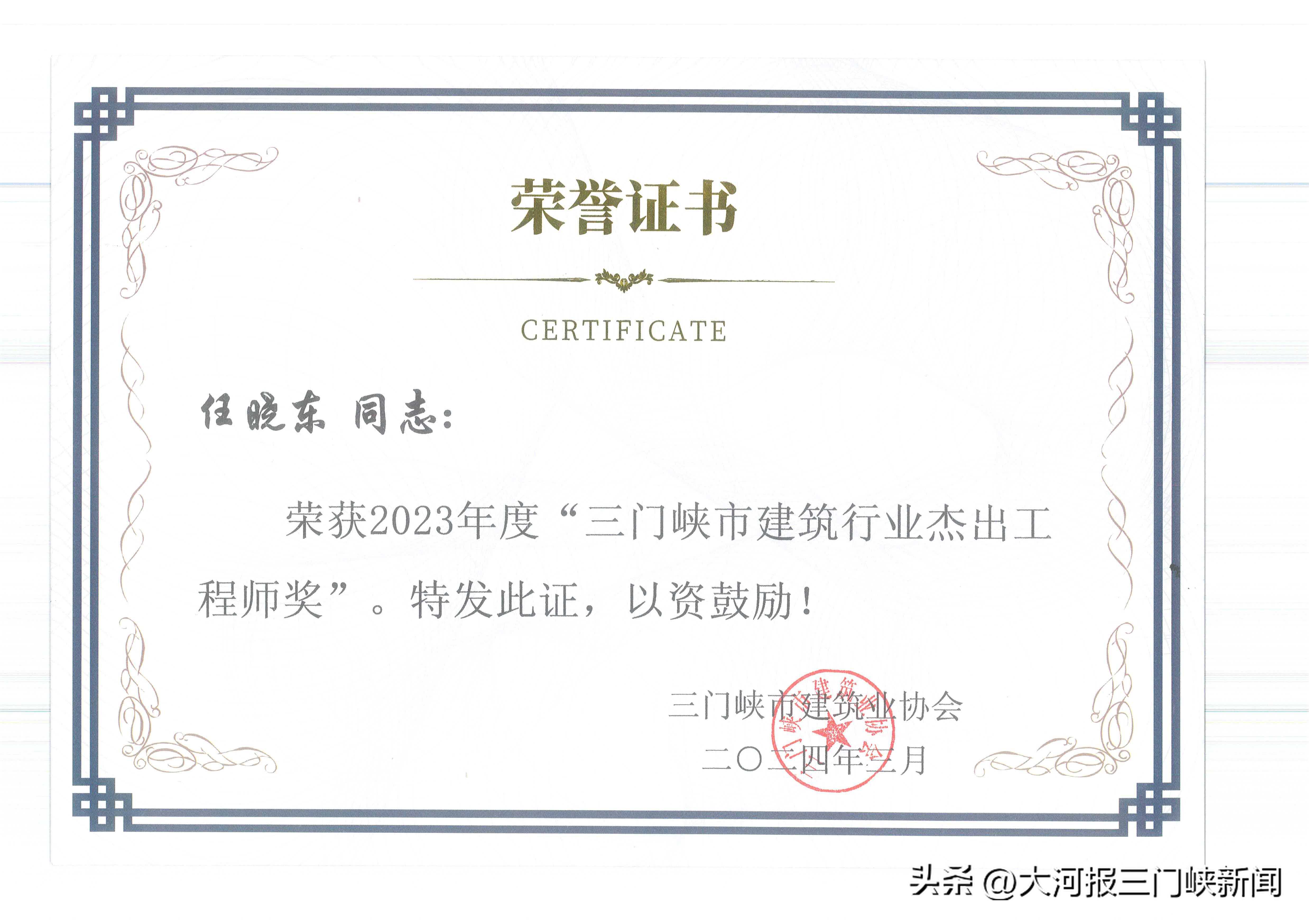 据悉,“2023年度三门峡市建筑行业杰出工程师奖”是按照《三门峡市建筑行业杰出工程师奖评选办法(试行)》有关规定,经本人申请、单位推荐、市建筑业协会评审和公示,最终乔海迎等45名科技工作者被评定为“2023年度三门峡市建筑行业杰出工程师”,颁发“2023年度三门峡市建筑行业杰出工程师奖”荣誉证书。