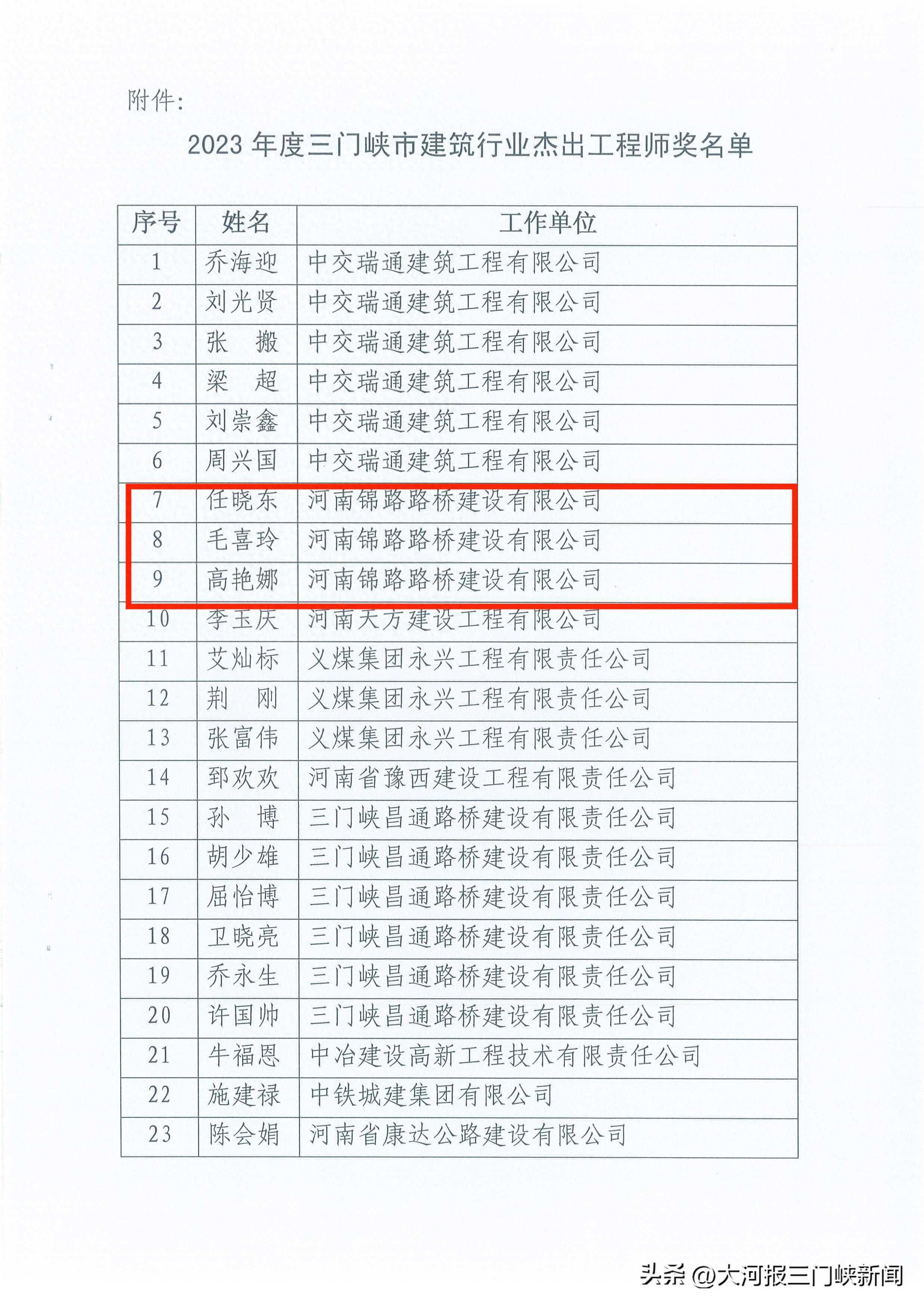 近日,三门峡市建筑业协会发布《关于公布2023年度三门峡市建筑行业杰出工程师奖评定结果的通知》(三建协【2024】4号文),对荣获2023年度“三门峡市建筑行业杰出工程师奖”评定结果予以公布,乔海迎等45名科技工作者被评定为“2023年度三门峡市建筑行业杰出工程师奖”。河南锦路工程联营中心总监毛喜玲、质检安环部部长高艳娜及锦路置业总经理任晓东三名高管上榜“2023年度三门峡市建筑行业杰出工程师奖”名单。