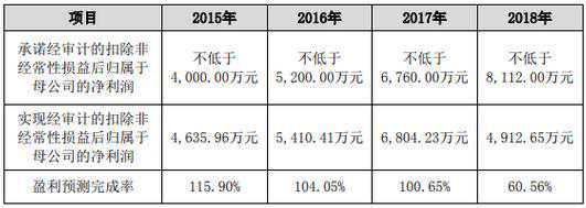 在收购拓明科技时,交易对手承诺拓明科技2015-2018年度实现的经审计的合并报表中扣除非经常性损益后归属于母公司股东的净利润分别不低于人民币4000万元、5200万元、6760万元和8112万元。