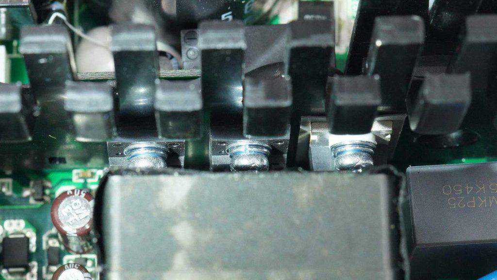 LLC全桥开关管来自东微,OSG65R380KF,700V耐压的NMOS,导阻380mΩ,采用TO263封装,四颗组成全桥,通过PCB铜箔散热,右下角是谐振电容。