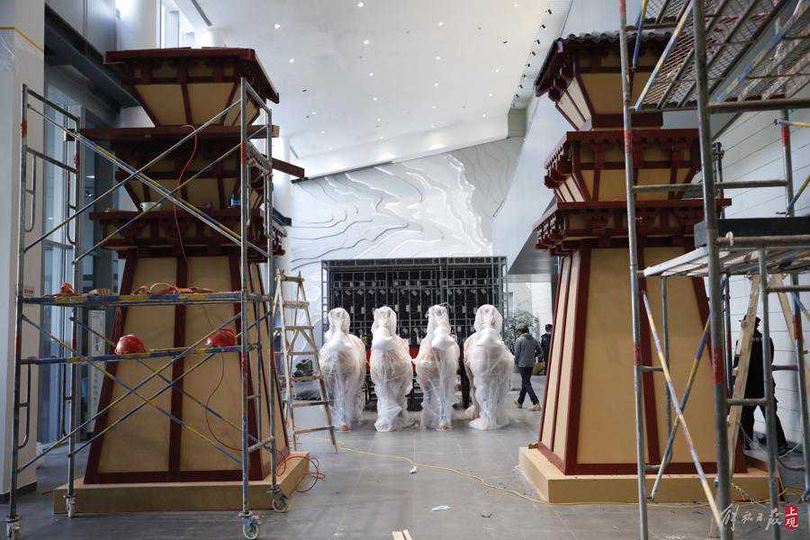 闵行博物馆策展人秦梦士和同事现场布展。
