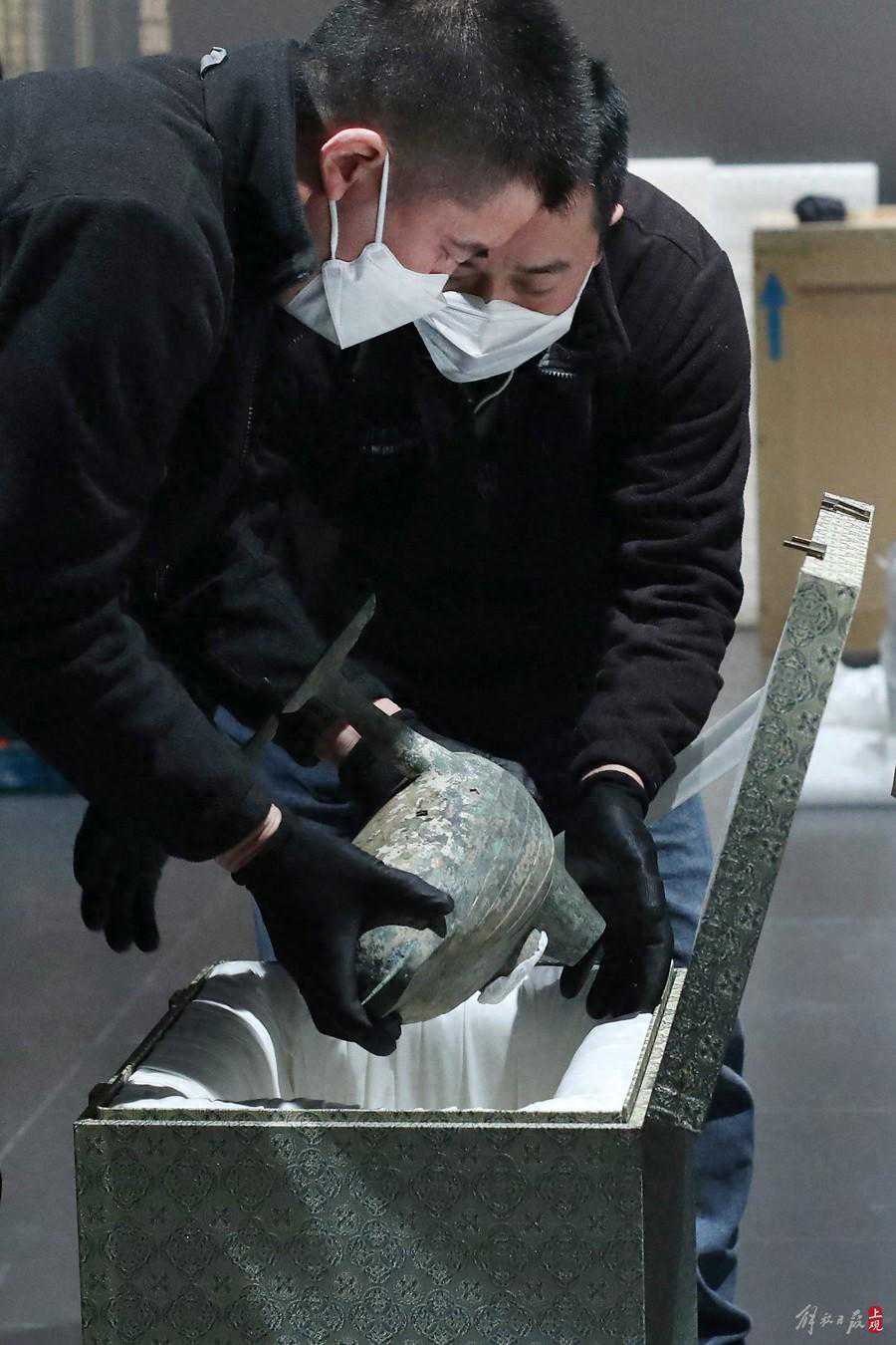 闵博工作人员对雁鱼形铜灯进行点交。