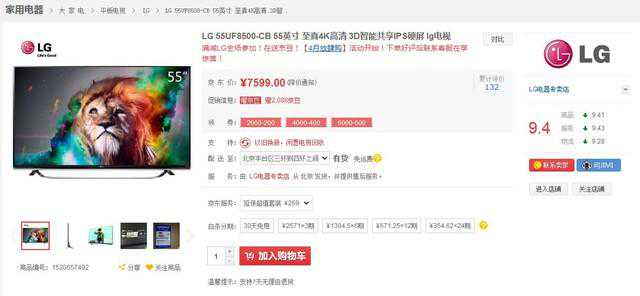 LG55UF8500-CB产品定位LED电视,3D电视,网络电视,智能电视,超高清电视屏幕尺寸55英寸屏幕比例16:9分辨率3840*2160液晶面板IPS硬屏4K背光灯类型LED发光二极管最佳观看距离4.1-5.0米上市时间2015年3月支持格式2160p(超高清)图像特点至真4K图像处理引擎,三重XD引擎立体声支持扬声器2.0声道扬声器音效特点多声道UltraSurround喇叭,哈曼卡顿音响网络功能支持,有线/WiFi3D显示支持偏光式3D显示遥控器动感遥控器操作系统系统外观设计无边硬屏机身尺寸含底座:1235×782×261mm不含底座:1235×727×51mm包装尺寸1330×810×152mm机身重量含底座:20.4kg