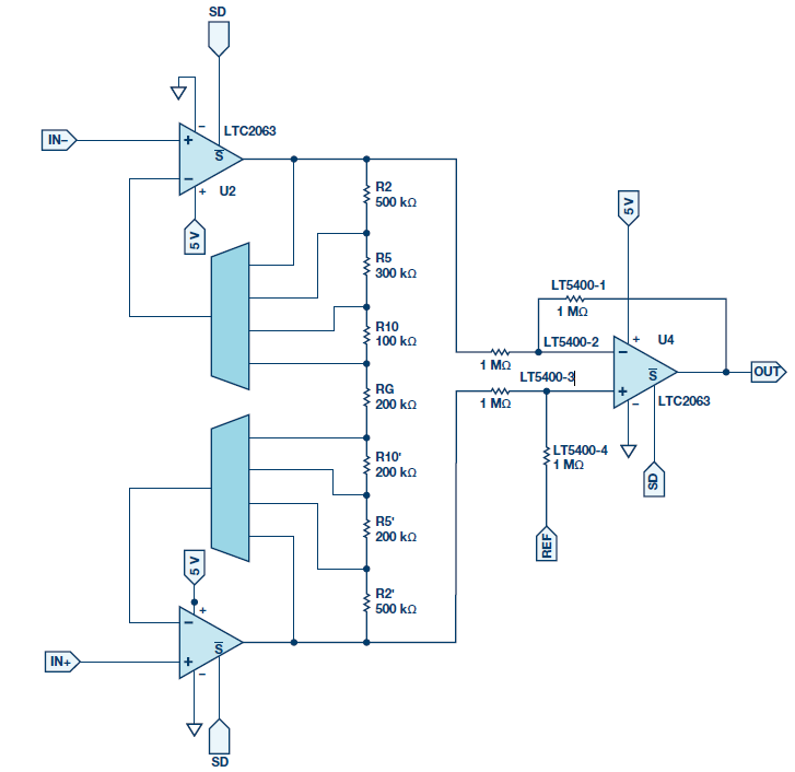 对于第二级差动放大器,LTC2063与LT5400四通道匹配电阻网络(1MΩ选项)一起使用。这确保了电流消耗最低,并且电阻的精确匹配保护了CMRR性能。