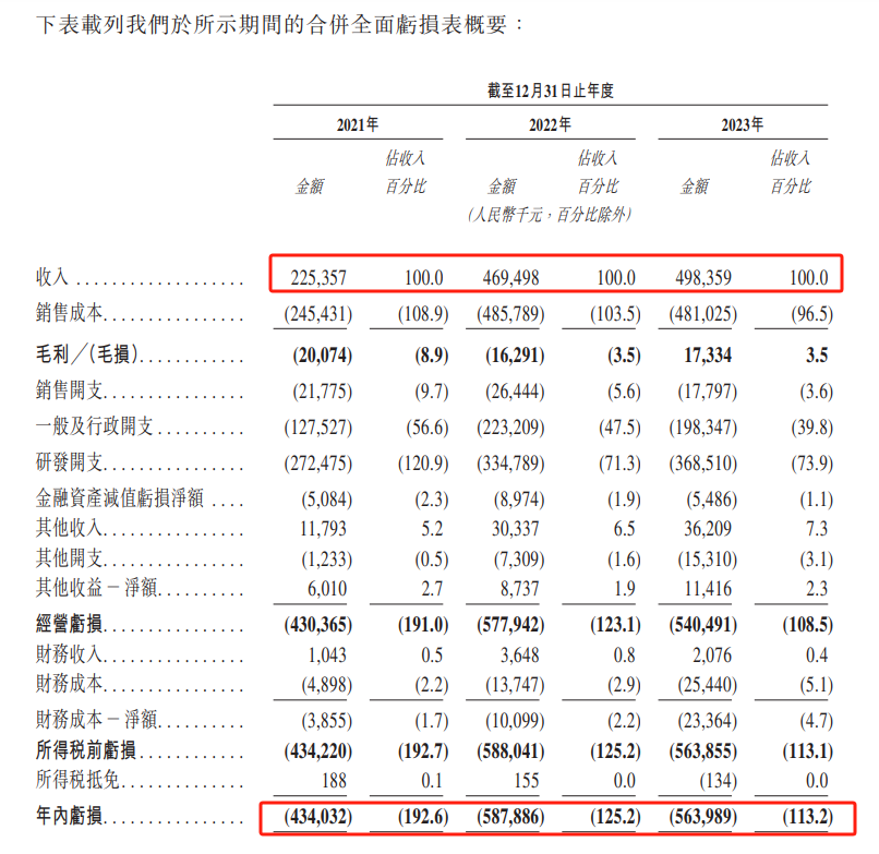 2021年至2023年,公司的净利润分别亏损4.34亿元、5.88亿元和5.64亿元,3年累计亏损约15.8亿元。造成公司大幅亏损的一个重要原因为研发开支较大,2023年研发开支占收入的比例为73.9%。