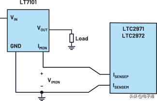 LT7101降压稳压器的IMON引脚就是一个具有电压驱动输出的引脚示例。输出还具有失调电压。也就是说,在空载条件下,IMON引脚保持0.4V。开始时,这似乎是有问题的,因为差分电压限值为±170mV。但是,LTC2972/LTC2971PSM器件可以检测这种类型的IMON引脚,并允许ISENSE引脚上具有更大的差模信号。给大家展示一个具体示例。